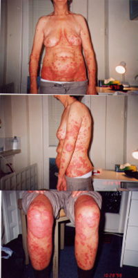 Ms C F, 62 years old of house wife suffers from a recurrent Psoriasis for all of her life. She is appearing a bad condition for last three months. She is found many big red patches covering on her truck, limbs with dry flecks and cracks on the patches which make her hot and itching in everywhere, and irritable, insomnia and constipation. She is given steroid creams, but she doesn’t think that it is still working, so she tries to take herbs.